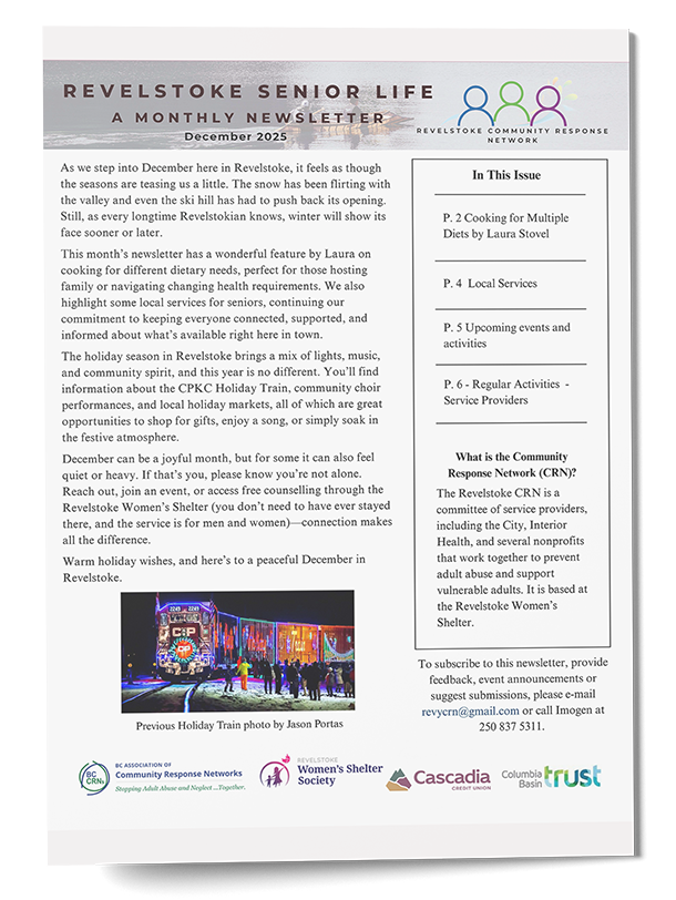 Revelstoke Senior Life is a monthly newsletter that shares interesting articles, courses, events and resources for seniors in Revelstoke.
