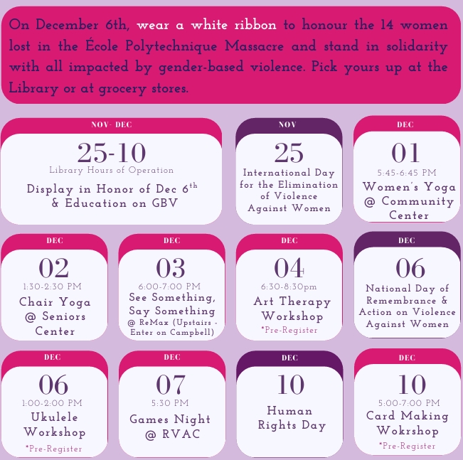 We have our December 6 display currently up at the Revelstoke Library, to honour the 14 women killed in the Ecole Polytechnique Massacre.
